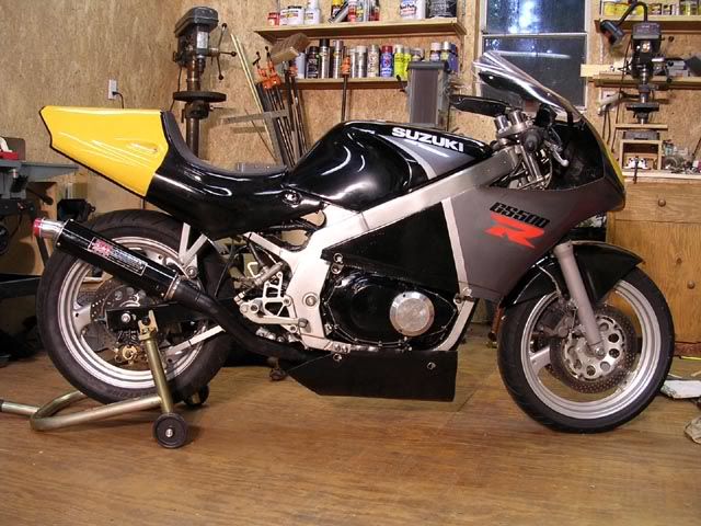 Coming eventually: 541cc with 78mm Wiseco pistons; K&N Lunchbox; Vance & Hines; 40 pilot / 147.5 main jets; Progressive fork springs; 15W fork oil; Katana 750 shock