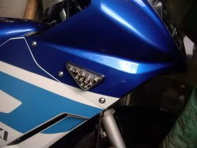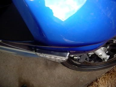 I just went to Cycle Gear and got 3 pairs of front flush-mounts, each with a different mount. The first were some Lockhart Phillips oval ones, and they stuck out and didn't follow the body's lines at all. Next were some MotoBoss ones, cat eye with the black part near the rear and amber up front. Didn't look cool, and were stick-ons (um...no)