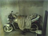 The Manager asked around and the person that's been here the longest says it was sitting in that exact spot when he got here several years ago.  The license plate has been removed...  The rear wheel isn't turning freely...  There's rust on the tank...  From the looks of it, it's been dropped several times.