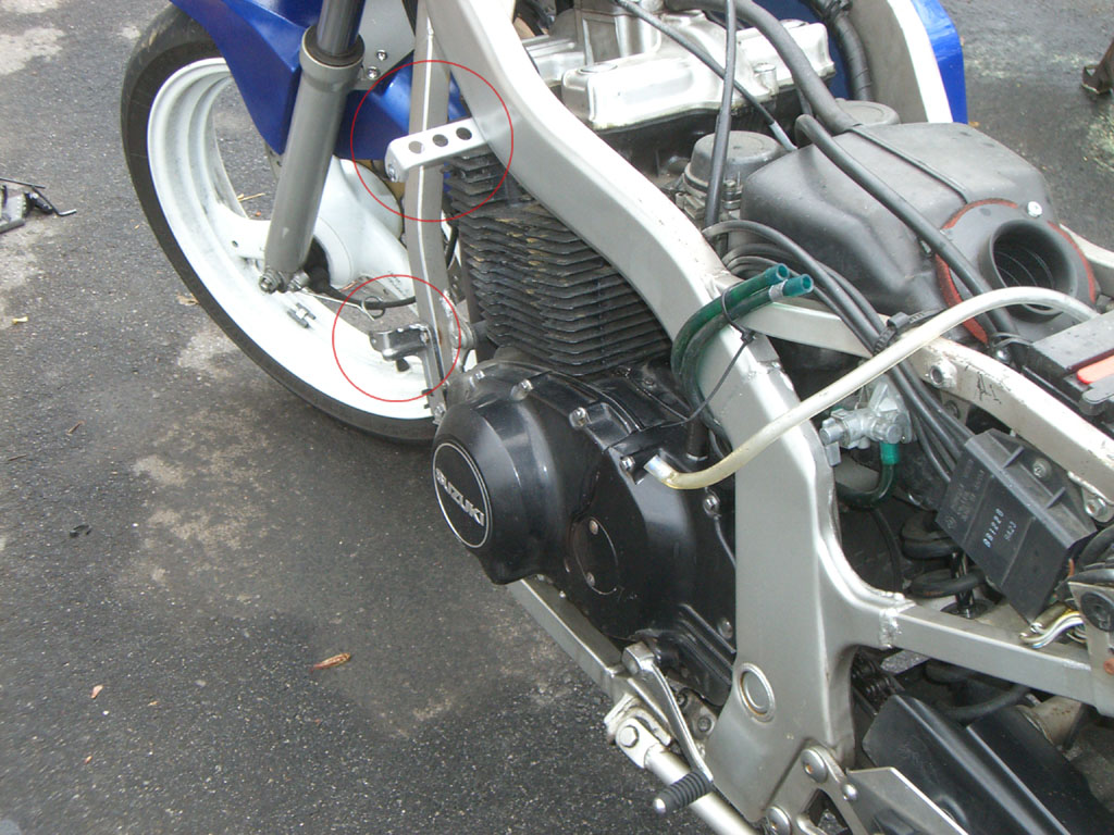 Well, I haven't ever completely dissasembled  the GS... but I did take the fairings off earlier today (valve adjustment) and snapped some photos of the brackets that Srinath added to the frame of Cheesy's infamous '89 GS500E to GS500F conversion bike (sportier than '04 models due to the '89's clip-ons)