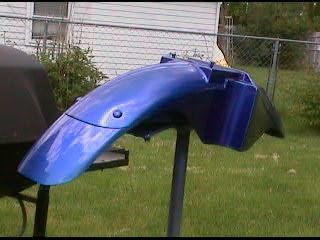 I didn't paint it myself, I had a professional job done. I ordered a quart of silver basecoat ($69) from Alsa Corp. He cleaned, kreemed, heated and removed the paint with a scraper and left the factory primer. Then he fixed my tiny little dent in my tank with bondo and a couple scratches in my side covers, primed again, and did 4 coats of basecoat. Then I went up yesterday when he sprayed the candy (2oz of candy per QT of clear). He did three coats of candy on everything. The fender, side covers, chain guard,  and grab bar got one more coat of plain clear and are done. The tank got wet sanded, the graphics were painted on, and cleared (plain) 3 more times. I'm just waiting for the clear to dry completely.