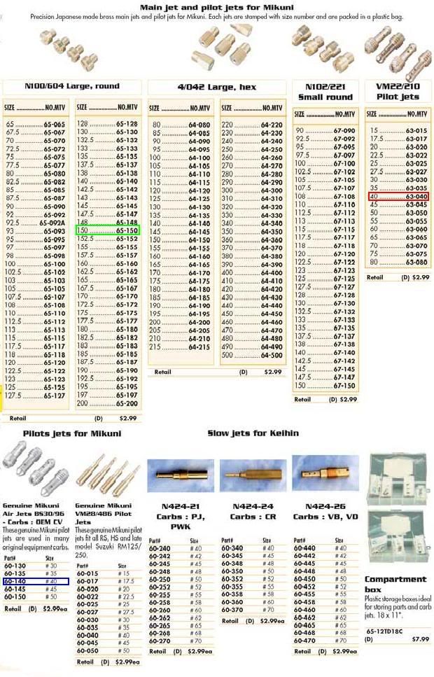 Got them! I had to go to a specialty race shop about an hr out of the city, but I got them. $16 for two main jets and two pilot jets. Sure beats the $150 for the Dyno jet kit. Currently I'm just sanding and painting my Vance & Hines system witch has a polished can thanks to my buddy, and along with the clamp on K&N I'm gonna have one mean sounding GS.  :icon_mrgreen: :icon_mrgreen: :icon_mrgreen:. Man am I ever excited.