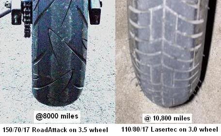 Now possibly the best of both worlds, the new Conti Road Attacks.  Conti's claim:  "giving the performance of a sports tyre and the mileage of a touring tyre."  I'm trying a Road Attack rear with a Lasertec front, my favorite front tire.  With over 2k miles on them so far I can confirm Conti's handling claim.  I find myself cornering faster now with the Laser/Attacks than I did with the sport touring radials or the pair of matching Lasertecs and doing so with ease and confidence.  I really don't expect the Road Attack rear to last the 13-14k miles the Avon and Metz sport touring radials did, but if they go the 10k miles at least that the Lasertecs did they will remain my first choice.  Final report next year on these.
