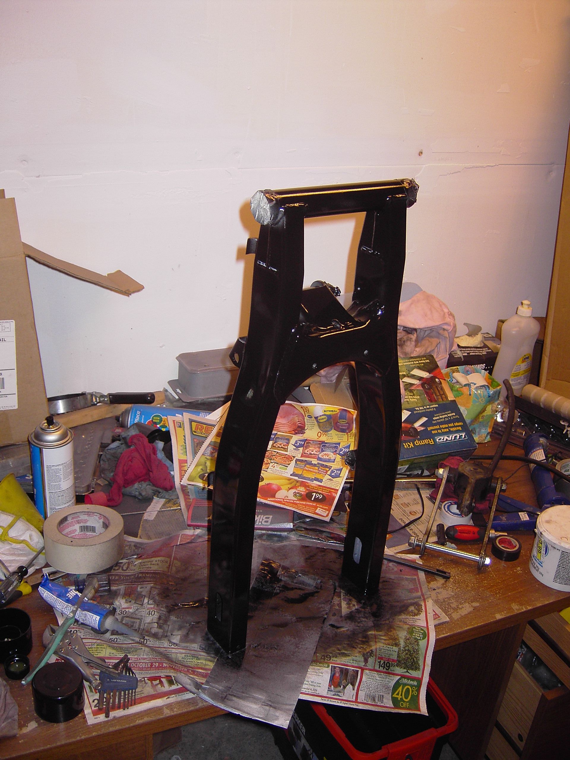 After the primer had set, I put on a coat of gloss black.  I will later finish with several coats of flat black to match the frame, but I didn't feel like shopping so I used what I had in the garage.