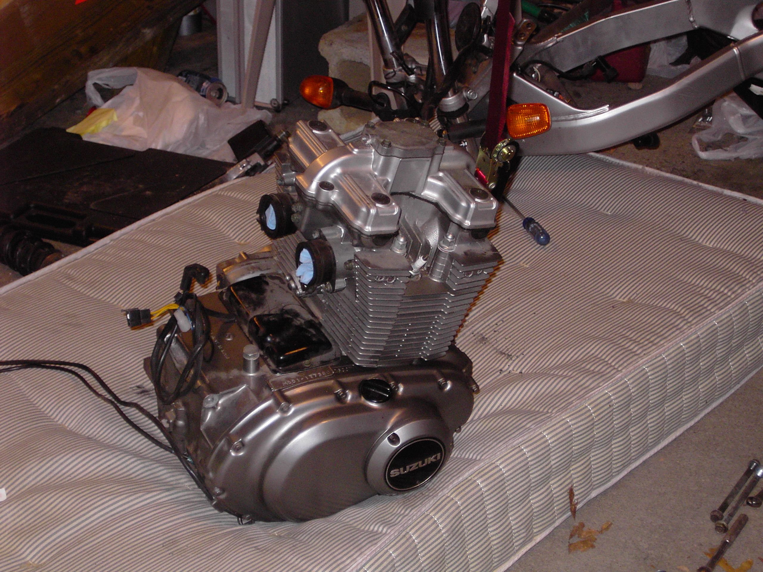 A lot of things happened before this picture.  I read on some web site somewhere to push the bike over on a mattress and remove the mounts.  This lets you basically "drop" the engine right out without damaging it.  I chose to use this method because there was no one to help me and it was midnight, so I couldn't call anyone to help me.  It worked great.  This is going to need some cleaning before it goes back in the guest room.  :laugh: