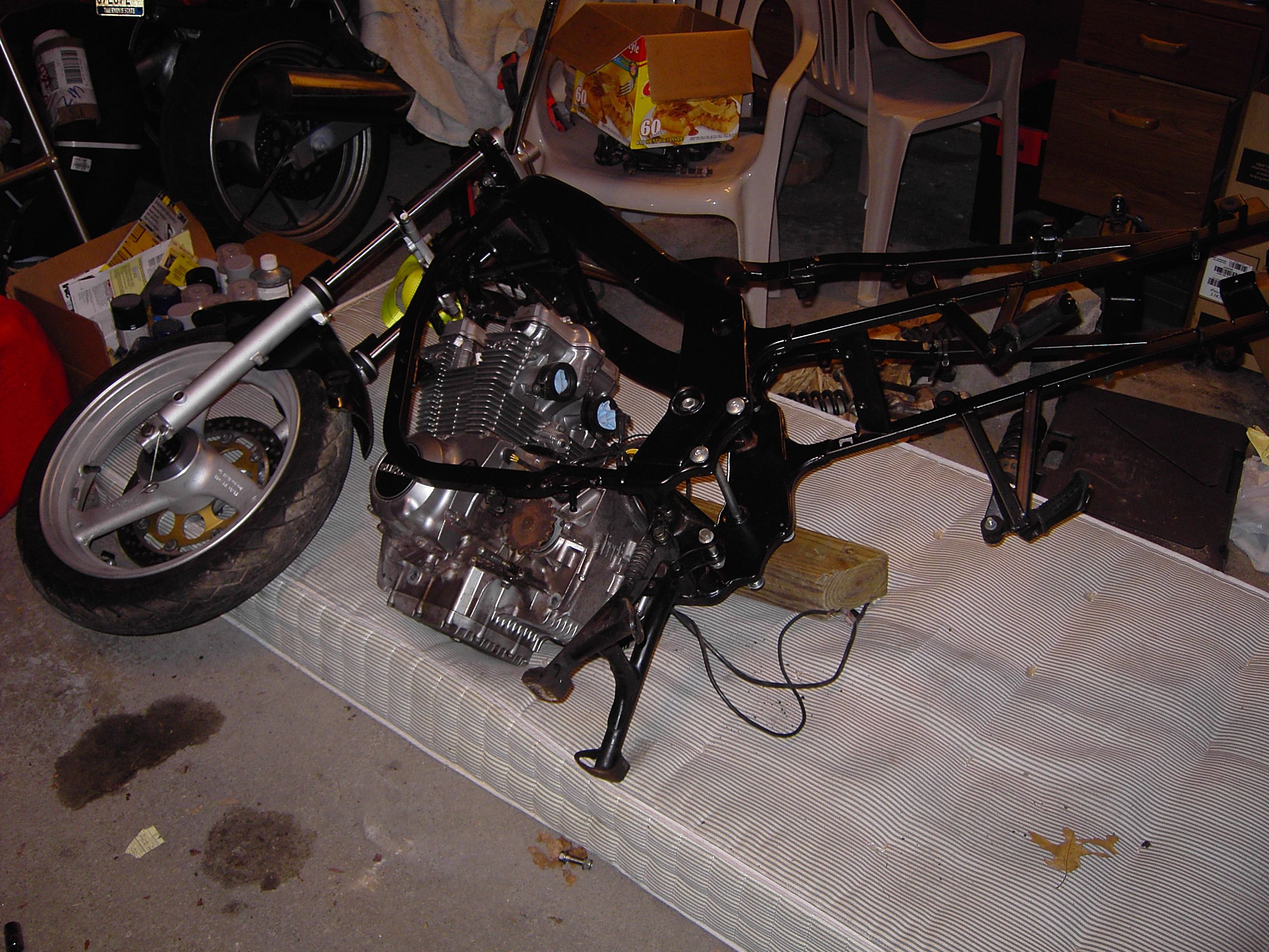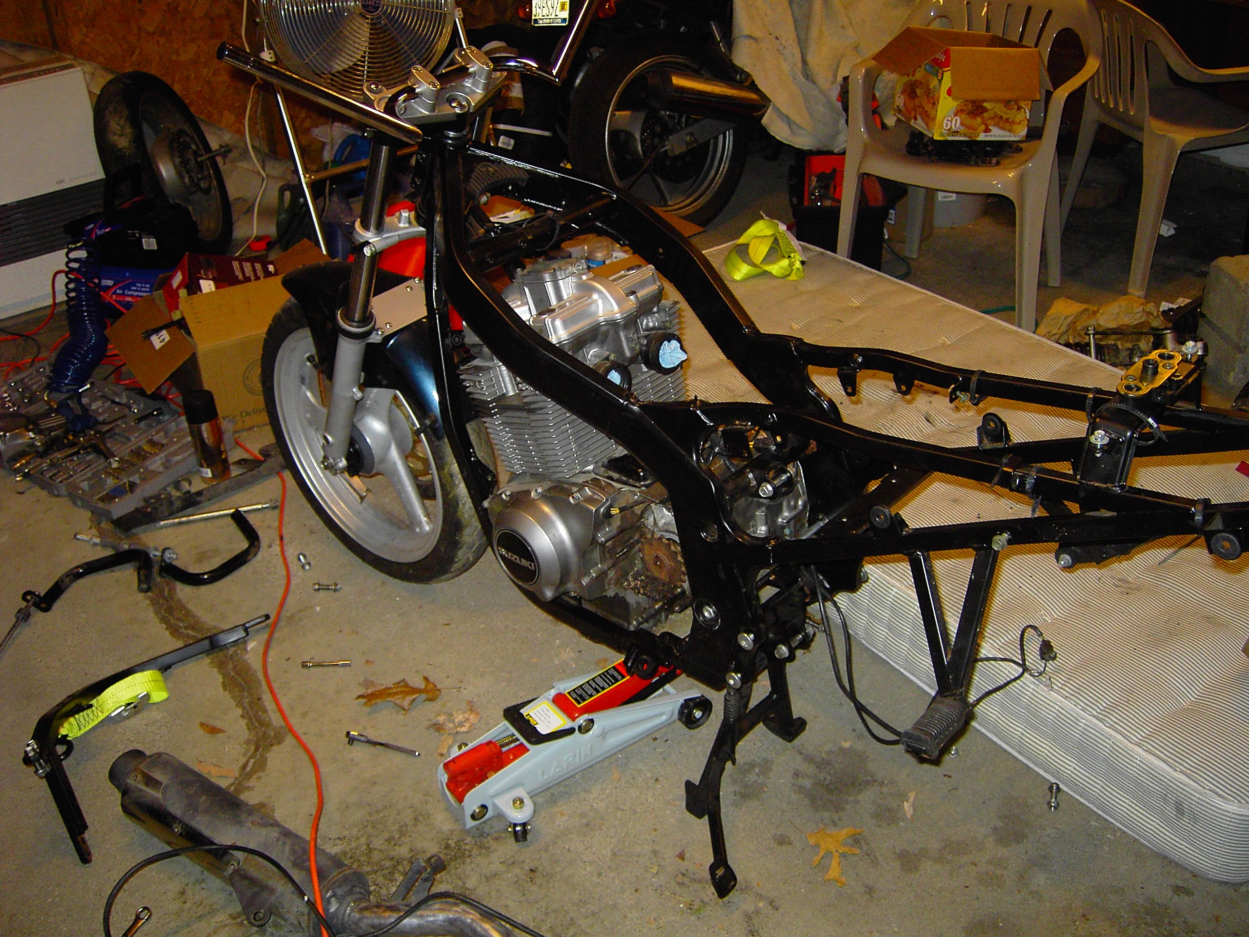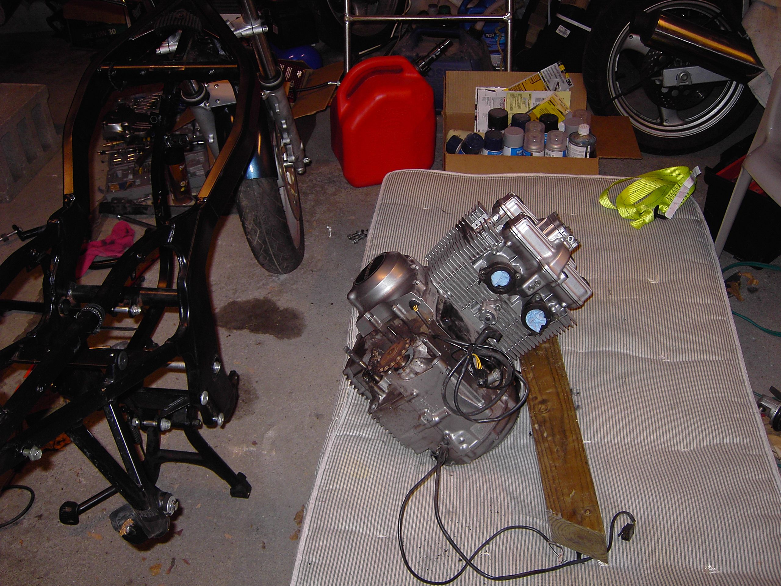 I set the engine sort of angly to prepare to set the new frame down on it.