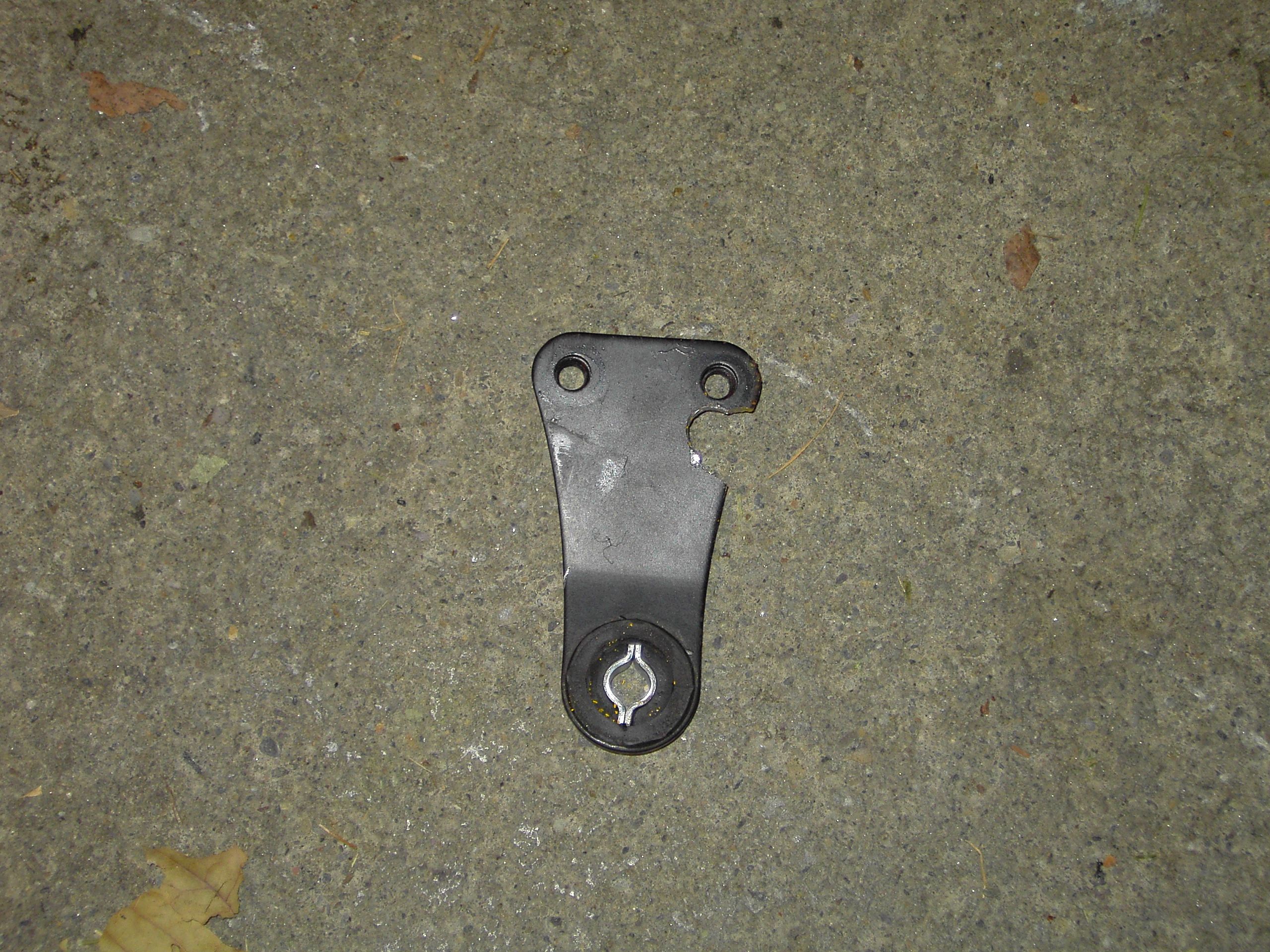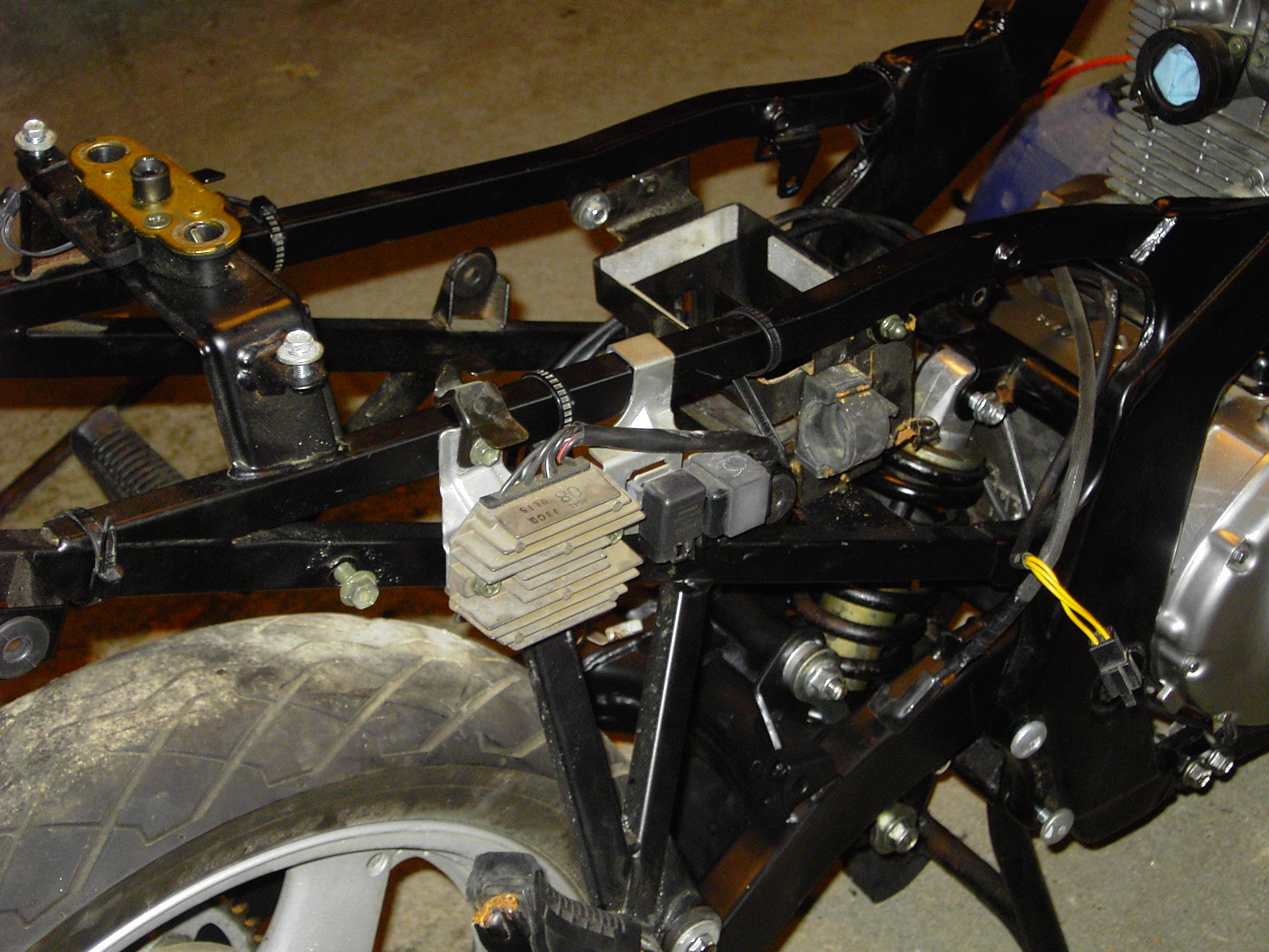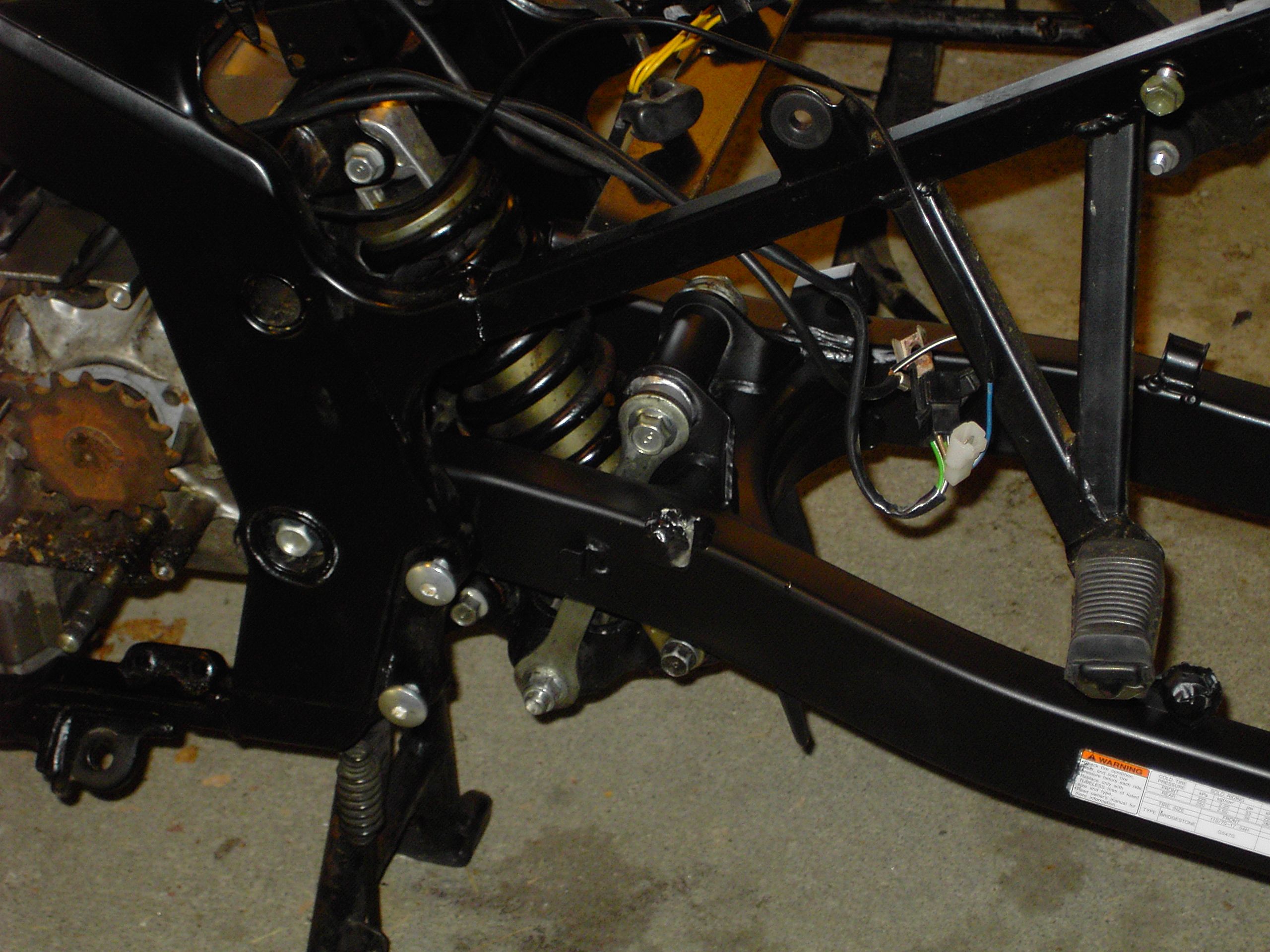 Here, I ran into my first incompatibility between the '01 and '04.  There is a nut welded to the frame, presumably for mounting the fairing, that interferes with the '01 horn bracket.  I cut out a piece of the bracket because I figured the remaining part would be strong enough to hold the horn.
