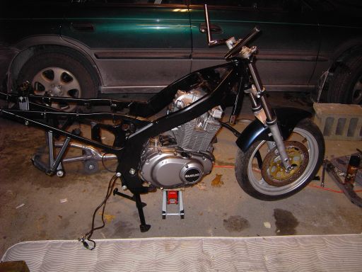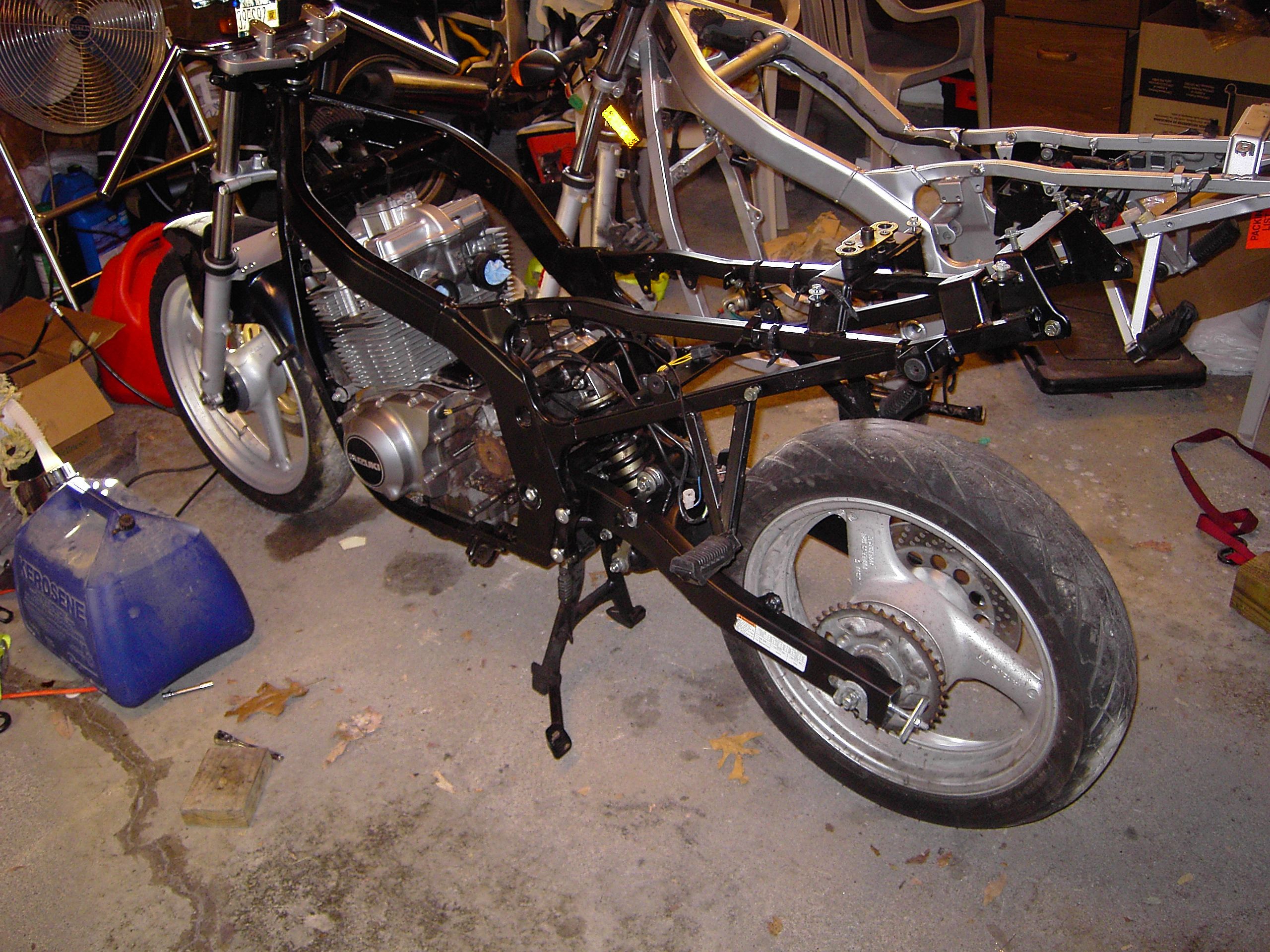 I slapped the GS wheel in so I can roll the frame around.  Also to make it look more like a motorcycle.  I can't tighten the axle because the brake caliper is not there, but I'm not going to ride it, so who cares.  When I get my tire in the mail, I'll mount it on the Katana rim and install that.  I also have a new rear sprocket to use.