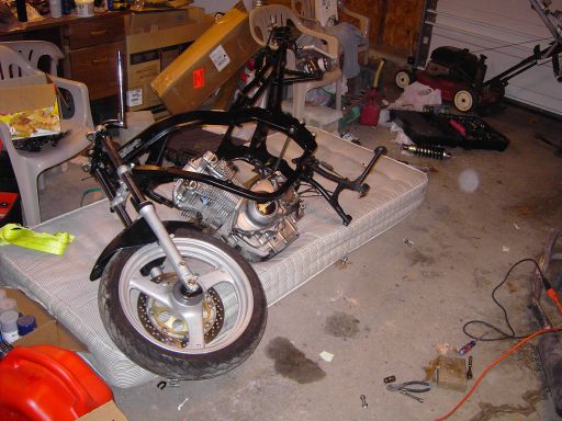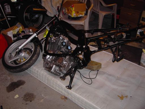 Yeah, so basically at this point I wrestled the engine and frame, using the flexibility of the mattress to my advantage until I could get the rear mounting bolts in place.  If my wife walked in at this stage, she would have divorced me for making the nasty with my motorcycle.