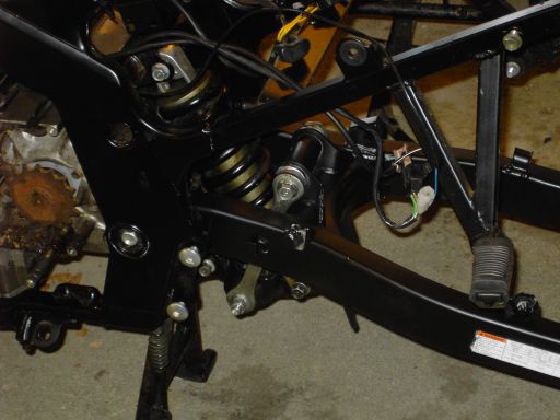 The next day (today, Sunday) I removed the shock, installed the swingarm, and installed the shock.  The swingarm is now flat black.  You can see I masked off the sticker that shows the tire pressures (because I forget all the time).  That was really dumb.  Don't do that.  There's a nasty ridge there and the paint likes to peel from there.  Live and learn.  In a few years I'll be forced to redo it.