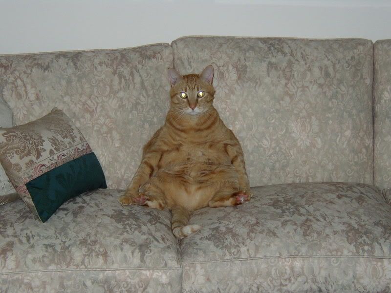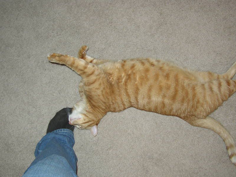 This is my late cat, Kitty.  He was 24lbs at his biggest, you can get an idea of his size when compared to my foot, I wear a size 12/13 EEE, my foot is seriously 5 inches wide.  I really miss him.