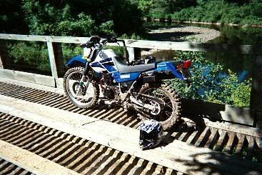 XT225 after very steep scrabbly hill complete with 3 foot ditch. You'll get more action videos of this later. This hill is a killer. My GF ate it pretty hard because she didn't get her front wheel over the ditch. The hill is about 65 degrees in angle from the horizontal, and about 300 yards long. It turns slightly to the left, then S's over to the right. The ditch is right in the middle. It goes down to the left of the pic.