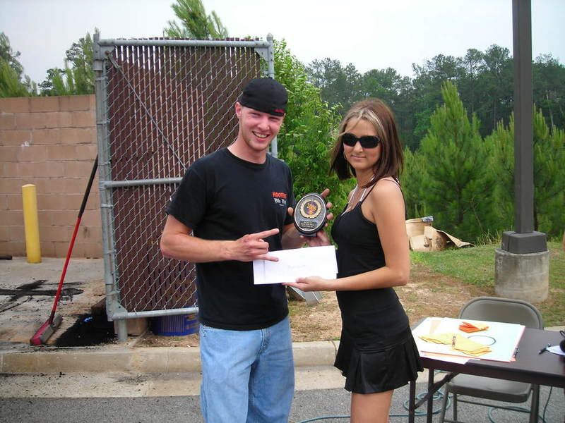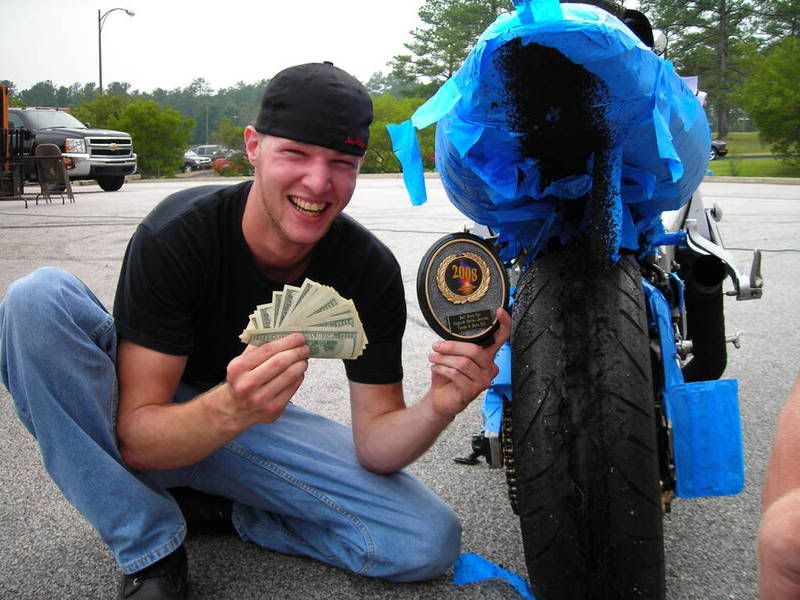 Saturday, May 10th.  Augusta Harley Davidson hosted a bike show/burnout contest/motorcycle sale; there was supposed to be a dyno drag session, but the machine broke down.  I had orignally planned on intering the burnout contest, but I talked myself out of it for fear of being cheated out of a win by the "Hardly" riders.  My buddies and I decided to shake things up a bit by riding out to show off some good 'ole Metric power.  We hopped on the bikes and made a nice little trip out of the 45+ mile ride, including a few wheelies down I20.  We got pleanty of looks when we pulled in the parking lot form the "hard core" types, but were glad to see a couple of faired bikes in the croud.  After hanging around, listening to the awfull music, drinking some free Monsters, and looking at the overpriced scooters in the showroom; my friends began to hastle me about the burnout contest.  I finally gave in and went to sign up, and was shocked to see there were no names on the list.  The pretty young lady at the table told me that the deadline for signup was 3p.m. and the contest was to begin at 4.  There was also a free tire up for grabs, as well as a trophy and $1,000!  I had to be at work 30 miles away at 5.  Oh well, I signed up anyway.  I wasn't about to spend hours scraping rubber off of my untertail and swingarm, so we rode over to Lows to pick up a roll of painters tape.  We got back and spent the next hour or so taping up the whole back end of my bike.  We were also told that loudness helps, so we pulled the can off of the mid pipe.  During that time, two Harleys and a CBR600RR signed up.  I went over and told the lady that I wanted to be last, so she penciled me in at the back.  I didn't want to blow out anyones ear drums, so I pushed my Gixxer over to "the pit," which turned out to be a three sided wall where dumpsters were usually kept.  So much for circles! The Honda went first, and did a nice little burnout in the first 3 gears, slinging rubber all over his polished under seat exhaust.  Next was a Harley that couldn't get out of first.  He burned his tire for about 6 or 7 minutes before it finally poped.  Third was a "jocky shift" bobber.  He had 3 guys in the pit trying to hold his back end straight, but ended up calling it quits early.  My turn!  I pushed my bike up against the wall, and cranked it up.  I looked back at the croud of 200+.  This was going to be fun!  I burned the sides of my tire for a while in 1st, then got bored and started shifting.  The speedo was reading somewhere around the 180s in 6th and I knew I didn't have long left.  I threw up the horns with my left hand and then grabed bars just before the tire let go (You can sort of see my arm raised in the video).  We all got a number and the croud got to write down their pick on a card, then throw it into a ballot box.  A few minutes later, they called my name out as the winner by 46 votes!  They handed me the trophy and cash, and told me to go inside and get the tire, but that it was a cruiser tire.  I gave it to the Harley rider who poped his tire.  It was about 5:15 so I hoped on my buddie Gavin's ZX-10R powered Z1000 and headed out.  My other friend Mike took off on his CBR929RR back home to get his truck and trailer.  Gavin stayed with my bike.  I gave Mike and Gavin each $300 for our trip to Myrtle Beach Bike Week.  I'm at the beach now, and the money is going a long way!  Let me know what y'all think of the video and pictures!