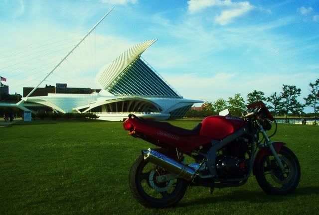 Here she is in front of the Milwaukee Art Museum.