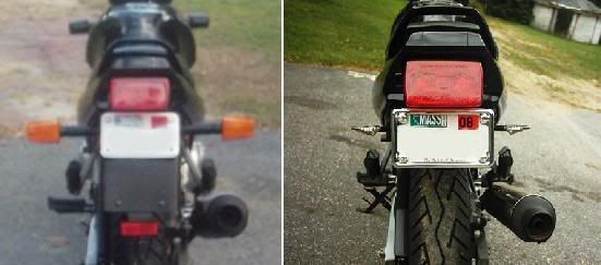The fenderectomy was just that. I want to go more aggressive though and move the blinkers up to right under the rear bodywork. I just took a dremel and made both the side cuts first then did an M or V shape down to the center of the license plate, then just chopped it off flat under that little rubber nub the plate backs up against. Took all of 5 minutes and you can do it with the fender on the bike.