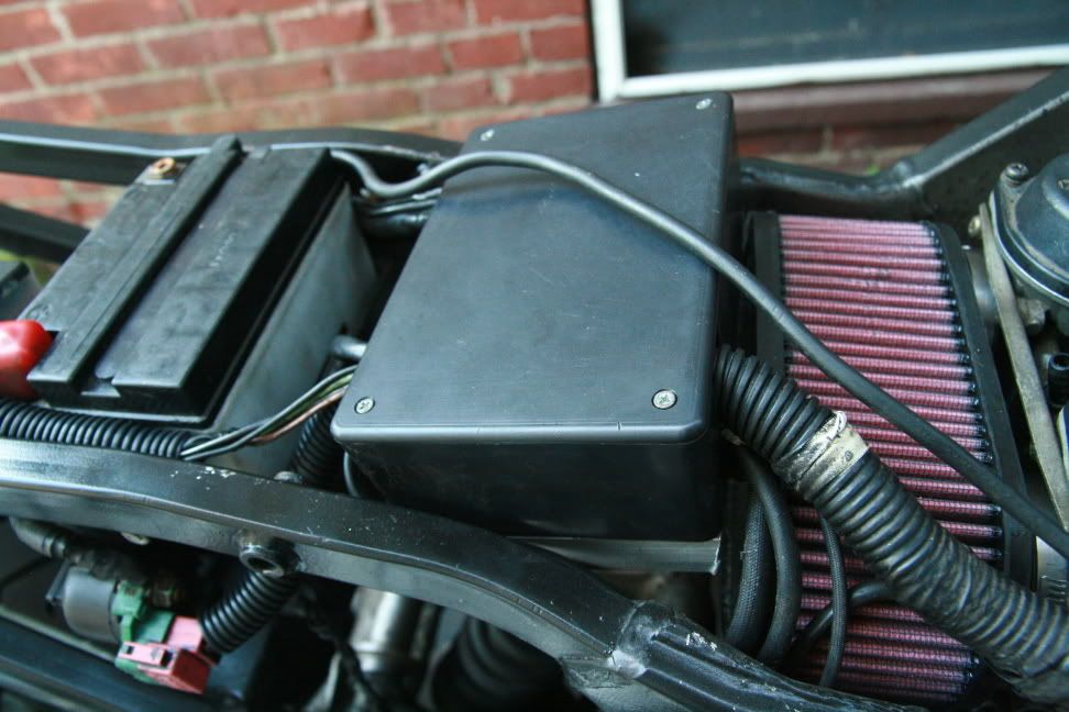 I went to radio shack and purchased a "project box". I mounted this box using two short pieces of aluminum angle stock. 4 holes in the bottom of the box, two on each side. i bolted it to the angle aluminum. I drilled a hole in the aluminum and bolted it to where the stock airbox mounted. (see pictures below). Now to get the wires into the box; i carved out some slots on the front and back of the box so the wires can enter the box. THE WIRING WAS LEFT INTACT. I ONLY EXTENDED 4 WIRES. I mounted the "ECU/brain thing" thats normally found on the left hand side under the project box. i relocated the rectifier to the old ecu/brainbox location. The only thing what is behind the battery is the 5 wires that go to the tail light.