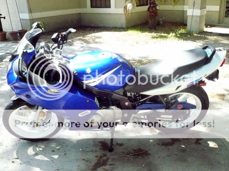 2004 F, Fenderectomy, barends, gsxr-pegs, pro grip gel covers, 15th JT sprocket, stock decals gone,custom chain guard,GSXR integrated mirrors, flush mount signals, 150 rear tire,white rims, rebuilt top end, V&H Exhaust, Custom heel and chain guard (Adidasguy)
