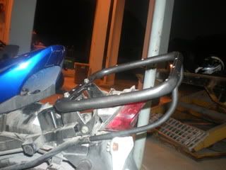 After fitting the tubes I took the rear faring off and bolted the rack frame in and measured where I wanted the bend to meet up with the rack frame. I bent it the same way I did the frame but with a smaller pipe for the bending tool. After I got one to mate upto the rack frame and cut to fit I put it in the vice and used it as a visual templet for the other.