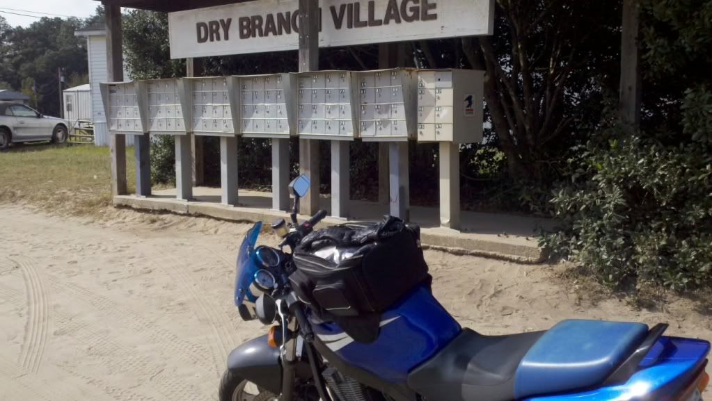You see the sand?  Right at the mailboxes it is packed enough to support the sidestand, no problem. But where I decided to turn around it is about 6 inches deep! Yeah, I dropped it. >:(