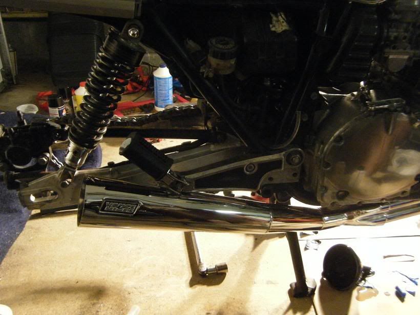 Well my new V&H 4 into 1 came today. Fitting the megaphone to the headers was a bit tricky, it was REALLY snug. Aside from that it bolted up perfectly. Prior to installing the exhaust I removed the old gaskets and put in new ones, which was kind of a PITA, probably the original ones in there. I reinstalled the passenger peg mounts which I had off in order to polish/paint them. Its hard to tell in these pictures but they came out awesome. Anyway, here are a few pictures and a short video of it running. It definitely needs some tuning and probably a carb clean, neither of which I plan to do until I try riding it and diagnosing what it needs. It started up nicely and idled smooth, although a little high at around 1400 rpm.