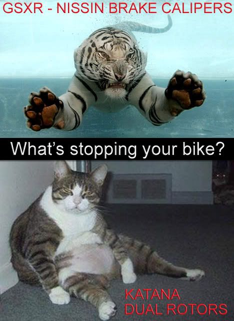 Now, i have read in different places here and there on the net about the EXCELLENT BRAKE FEEL! the braking system on this GSXR FE i have for sale has.  And why shouldn't it?  It was installed on a sport bike!  What about your Kat FE brakes?  Can it make the same claim?  Nope!  The Katana is nothing but a bottom feeder.  It's not a sport bike, it's a look alike!