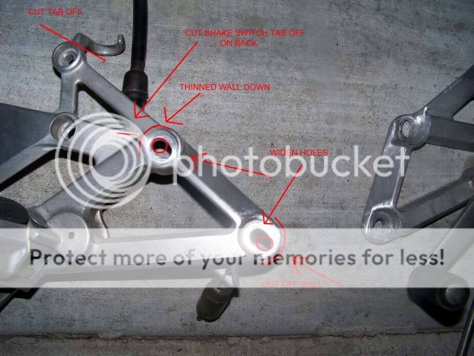 CBR F2 rearsets installed. To allow the right side to fit I had to cut off the tab that holds the reservoir feeder tube, and the tab that holds the rear brake light switch. Dgyver said that I can use a brake pressure switch ( http://www.1888fastlap.com/store/customer/search.php?substring=pressure+switch ) that will allow me to keep the rear brake light functional. So ill be trying that, but if you notice in one of the photos there is little clearance for the wires to exit the banjo bolt on the master cylinder, so Ill cross that hurtle when the switch arrives, worst case scenario I'll mount the switch on the caliper side of the brake line. I also bent the stock shifter after cutting to make it hug the sproket cover a little more closely. This set up may or may not change in addition to the other mods I have in store for the bike. I will also be re-polishing all the pieces before the final Assembly. Also the stock shifter was repositioned to retain the stock shift configuration, If you desire a GP Shift pattern reposition shifter in the downward position.