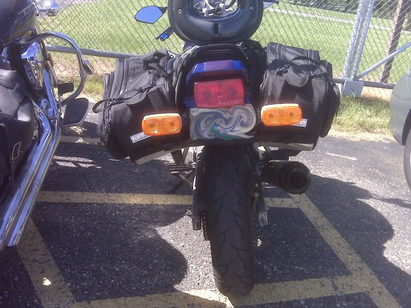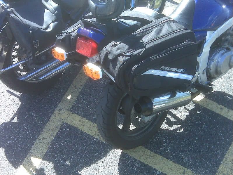 I recently installed... the vista universal throttle lock, annodized blue aluminum bar ends(1.5 inches to make up for the hand space lost with the throttle lock), fieldsheer's compact saddle bags, new mirrors with integrated led blinkers (four front led blinkers total). Due to the placement of the saddlebags they now hide my "smoke" blinkers which installed when I had done the fender elim. my solution: i bought and bolted together (2x) 2 4" angle brackets which i bolted together in a z patern, (I also sanded and repainted my exhaust with the 1200 degree grill paint) with the left over paint i had, I painted these brackets and bolts black (everything has been locktited! :D)... I then bolted these pieces under the tail light and the liscence plate to the outside bolts. this allowed for the clearance that was needed to for the blinkers to be seen behind the saddle bags, I then bolted some WalMart Trailer marker lights to the end of those soldered them up and clipped them on to the hot blinker wires, I havent gotten a chance to take pictures yet, but I'll get them up when I can. Leaving for the haul around lake superior on saturday, hopefully the weather holds out for us.
