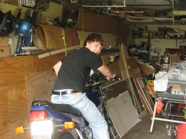 Pav moving the GS into resting position.  Things to note: 70s American Flag helmet hanging on the wall and the copious amounts of clutter in the back of the garage.