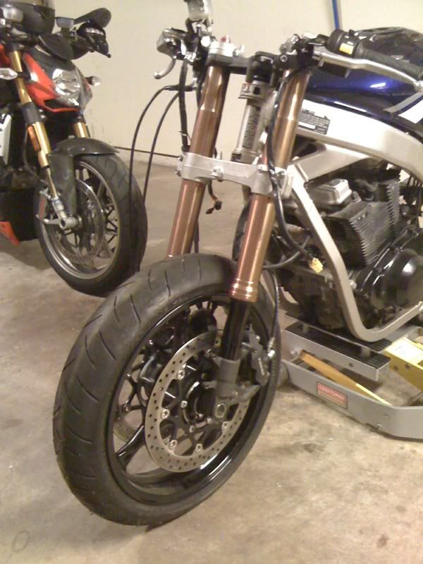 Well, I have been a little busy and a little lazy for the past 6 months. So I cleaned out the garage and began trying to remember where I left off. I removed the ignition assembly from the top bracket and went ahead and installed the complete front suspension, clipons, tire, etc... So without further adieu....