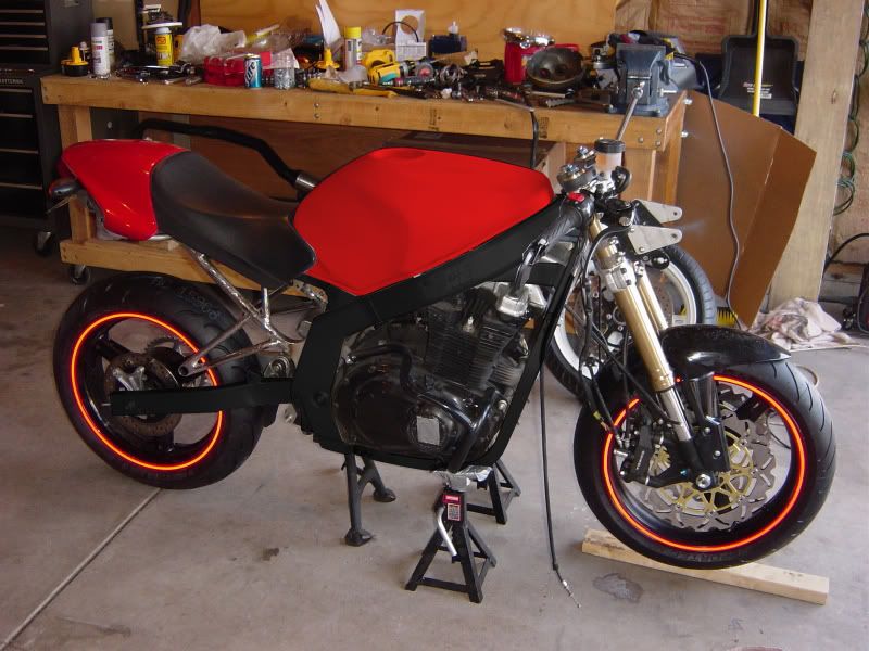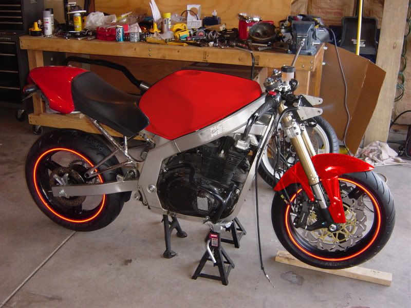 I could go either way. I really like it both ways with the red or black fender. I know black always looks good, but I feel like with how much work you put into it, you should stick with red instead of black. No one's even going to tell it doesn't look like a GS anymore if it's all black, or they'll just assume that it's a ducati because it'll all blend in. If you do paint it black, you should paint the frame and swingarm black as well.