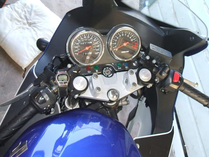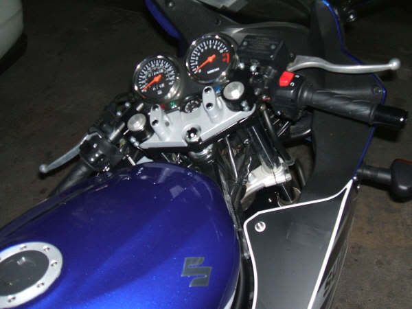 gsf- it's tucked away in my Parent's garage at the moment. Look at the pctures above, I removed the silver colored handlebar mount, and didn't need to move the forks at all, just slid clipon right over fork tubes. The two-piece mounts I had made up I mounted UNDER the triple, this lowered the gauges a bit, but helps as the clipons brought me closer to the gauges anyhow. I thought the black triple would look terrible under the bar mount riser, but I actually think it looks kinda cool, like a "works" one-off custom triple. I may have a plate made up this winter, I haven't made a decision yet. I have JUST enough room at full lock each side for hand clearance (i wear a 3x glove,BTW) so parking lot manuvers still are easy.