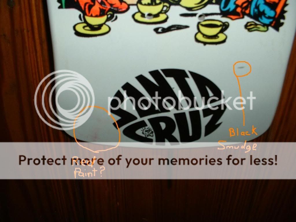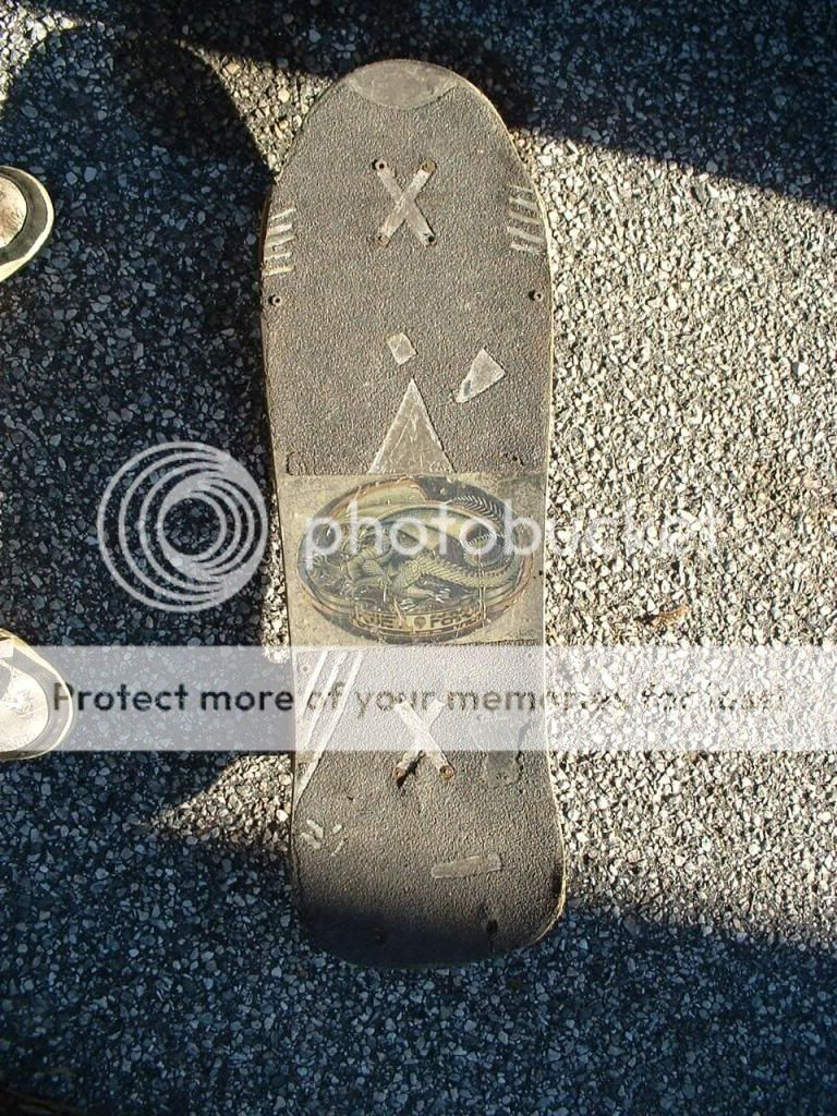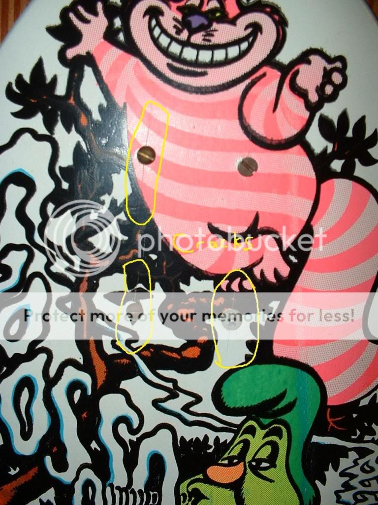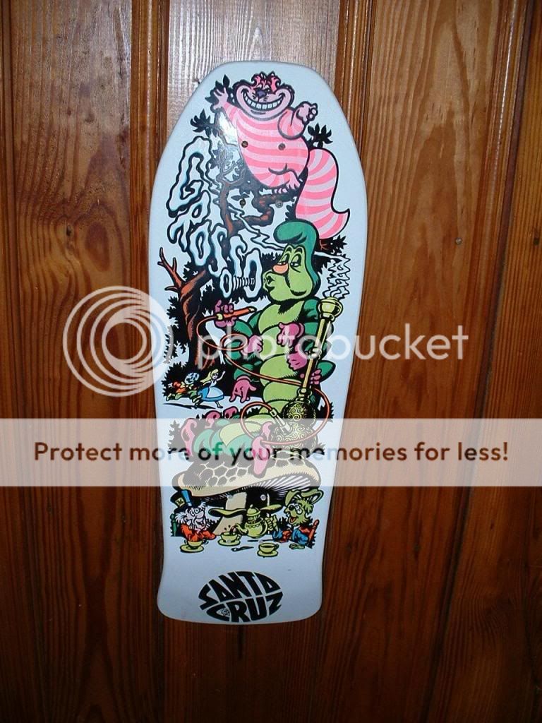Anyone here know vintage skateboard decks?  I was researching an old Jeff Grosso board on the internet and saw there are some reproductions of the Alice in Wonderland board made.  I bought one of those boards back in the late 80's and it has been hanging as a decoration in my mom's attic ever since.  Any idea what an original is worth now?  There are a couple smudges and some cracking around the front bolt holes where it was screwed to the wall.  I'll put some pics below.  Thanks for your time and input!