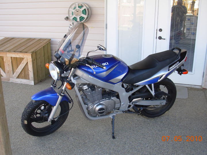 07 black GS500F; fenderectomy, NGK DPR9EIX-9 plugs, 15T sprocket, Jardine exhaust, K&N lunchbox, 20-62.5-152.5 jets 1 washer, timing advance 6*, flushmount signals,Tommaselli clipons over tree, sv650 throttle, 20w forkoil, sport demon tires, Buddha fork brace, Goodridge SS lines, double bubble