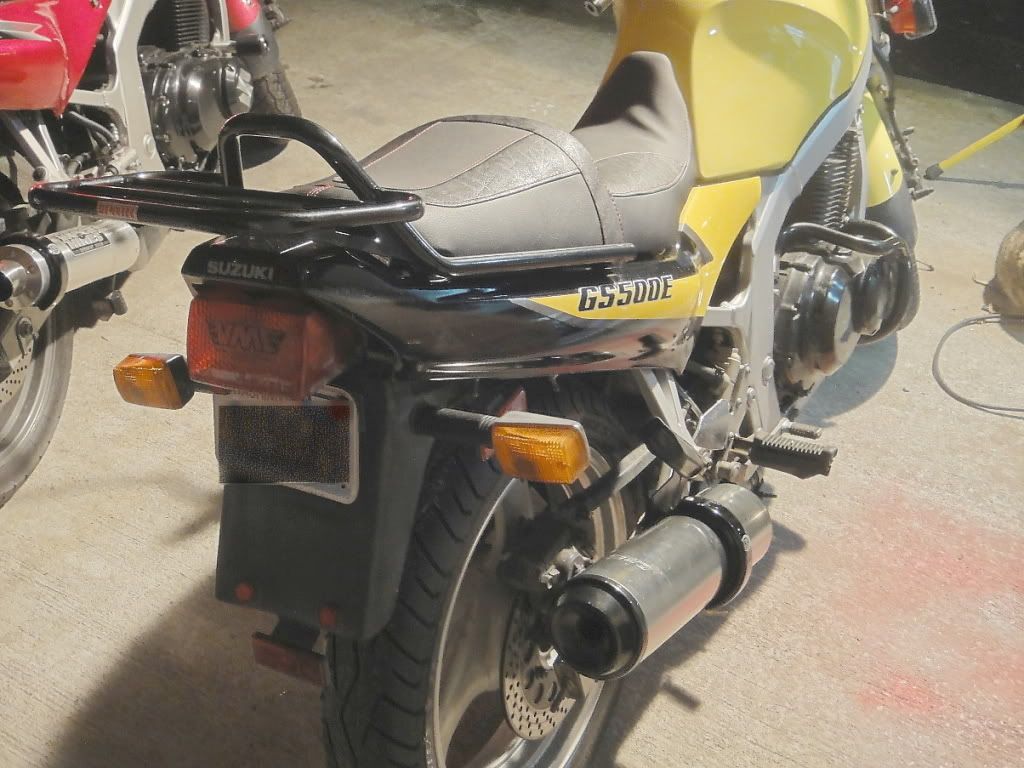 Went to garage to find the engine bars for someone else and found the Renntec rear carrier so I took 2 minutes to put it on Trey to see how it looks. Not bad. It all depends on where Trey fits into the scheme of  things: Suzi is the "SUV" for trips and going to the store, Junior is the "sportster" for having fun and Trey - well - still deciding his ultimate purpose. More mods to come as parts arrive from Europe. He will be purple for a while. I got the whole set. Then maybe red with the pink squiggles since I have a new tank and found the matching tail. Then ...... his final destiny! Into the unknown! The original factory "E" model full fairing?  Keep him sexyt and naked? Gimbel or Raask rear sets? Or do them all by getting a 4th GS500  :cookoo: