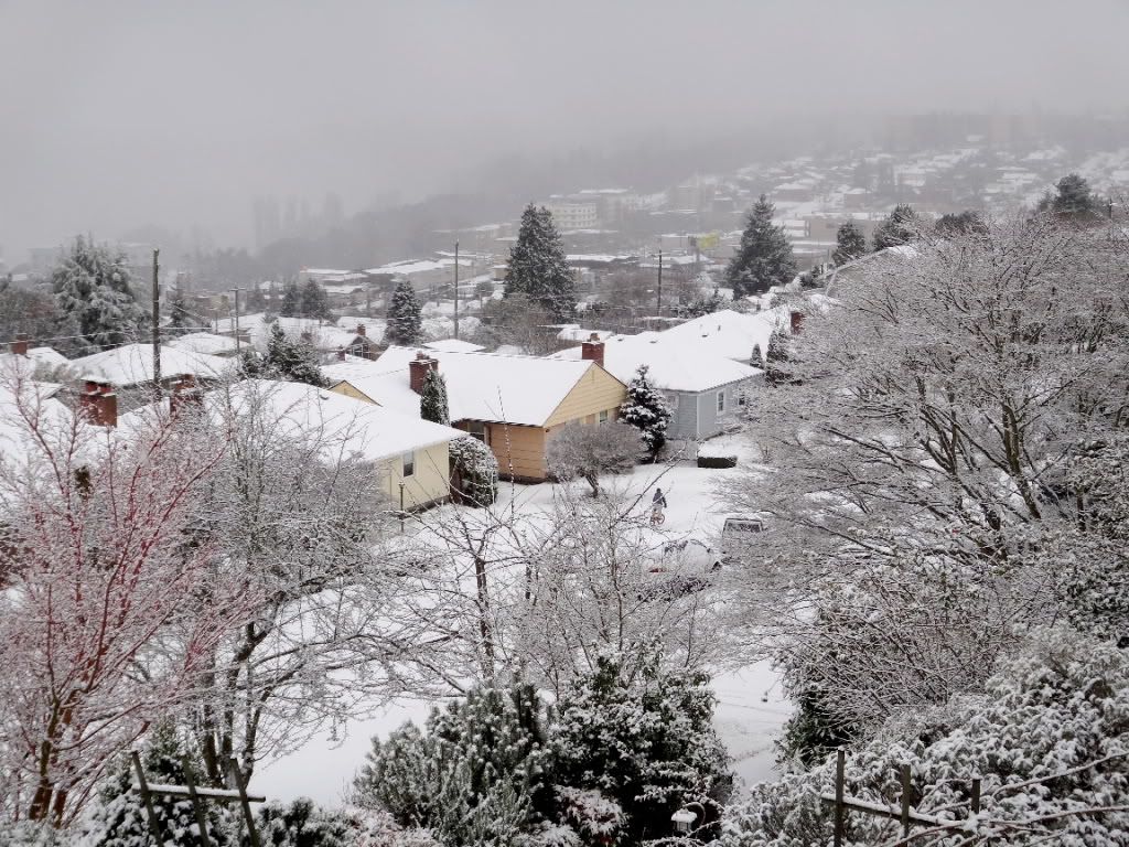 Rare for West Seattle. But as is typical: first rain then temp drops and snow comes. We get a ground layer of ice with snow on top.