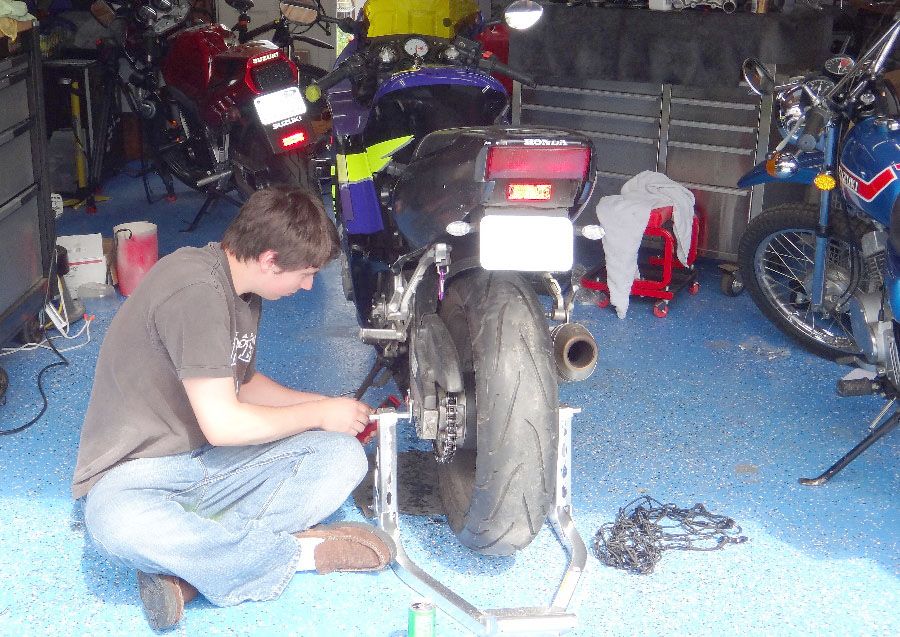 Went to Harbor Freight and picked up a rear stand for the CBR. Then the CBR got the chain cleaned & lubed and an R&G carbon fiber toe guard installed. We also repaired some of the plastics of the CBR with Plastex plastic repair.