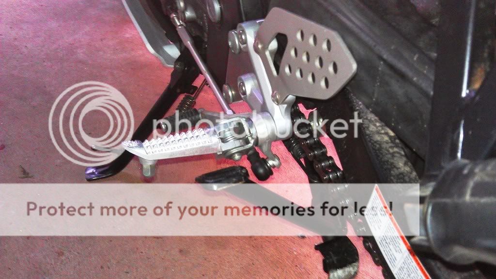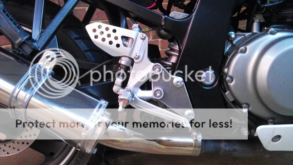 '05 GSXR rear sets on adapter plates. FINALLY I got them right after 3 tries. 2" back and 1" up from stock. And it clears the centre stand! :D Plates are made from 10mm aluminium.
