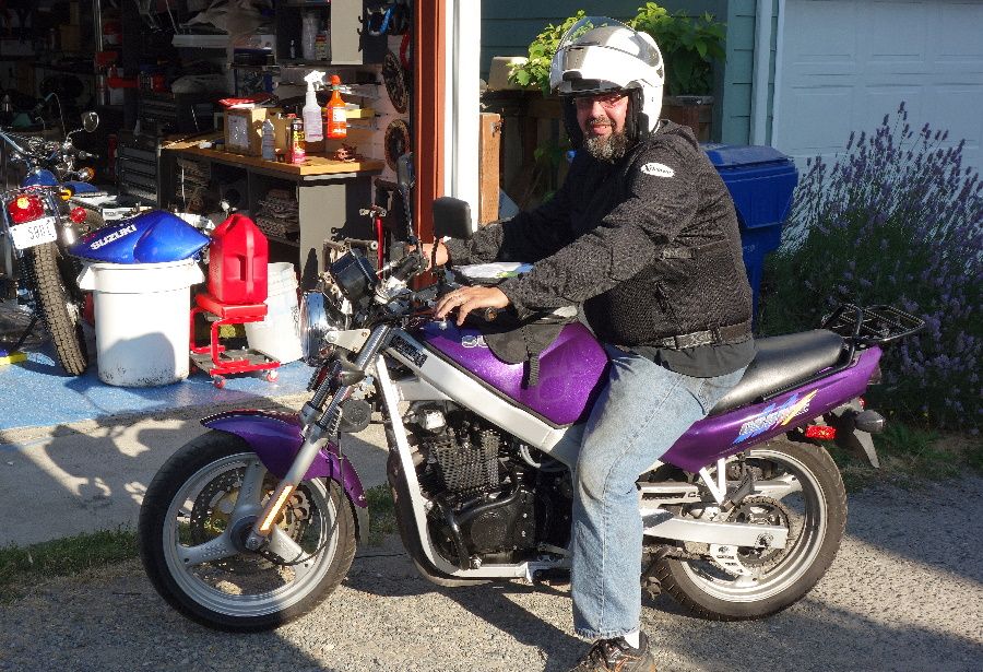 I said goodbye to Trey. Northwestrider drove him home after we spent the day doing all the wrenching. He now knows A LOT about the GS500. Next year he and his wife will take a ride to Alaska. She will ride Trey. She likes purple so I gave her the purple trimmings.