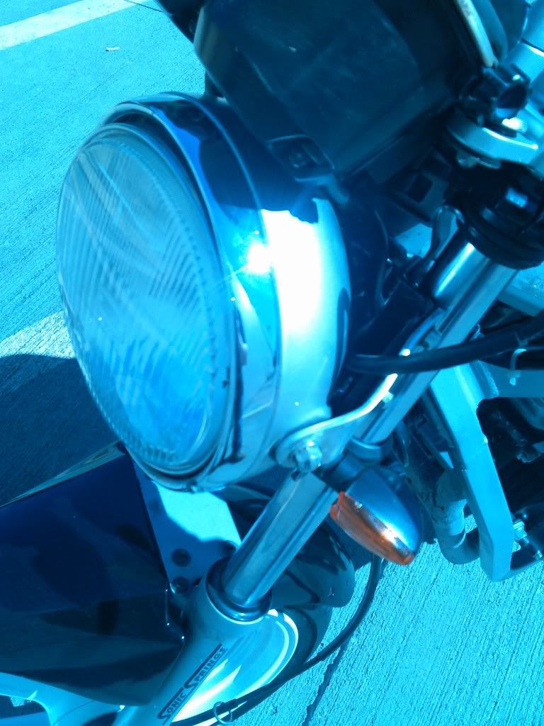 I let her take a nap going 40 mph on the side of the freeway in the bumpy grass after acting like a dual sport for a few seconds. Damage to the bike was not too terrible, other than some minor scratches to my brand new paint job, the only damage was the left bracket for the headlight got pretty dang bent up, and the light popped out a little bit.