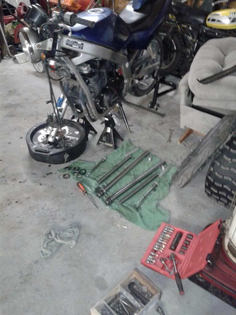 saturday i started replacing my fork seals, right up until i couldnt find my fork oil. DOH! <smash head into wall> so here she sits