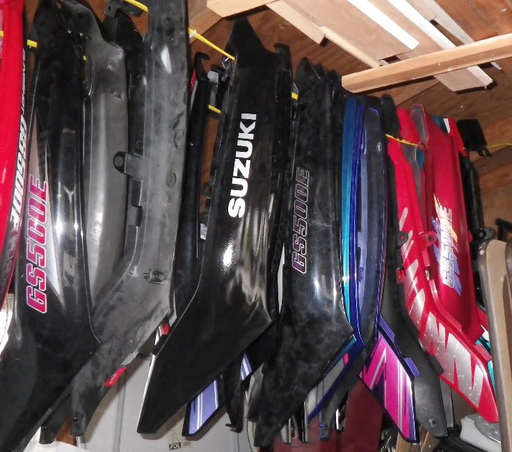 The bottom set is over at scottychop's. He decided to go silver. It is a really nice set - cleaned and clear coated already. The others except for the one that just says SUZUKI are in storage. I guess I could get them out if you wanted them this weekend and get out a seat that someone else wanted. Trying to keep things out of the way while the garage is being expanded (photos will be posted of my larger bike work space when finished). There is a blue set like the black/yellow set (blue with black decal) and somewhere a purple set but I don't remember specifically which purple. Not the same purple that Trey has.