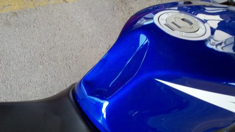 That tank dent is very very very likely not the result of a driveway drop. Its most likely the result of a sunday night thrash to get the bike back together and an overzealous shove to get the tank back on. Or it fell off its perch 1/2 full of gas when someone had the tank off. The only tank I have seen with that sized dent was that way.