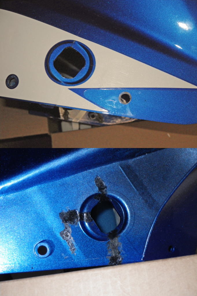 Here is the repair from the inside and the outside. New tape was put on (that stuff is not cheap!) Plastic weld done by a pro that does it for the dealer since the lady that knocked over Suzi paid for it. I put a brand new one on Suzi and keep the repaired one in storage as a spare.