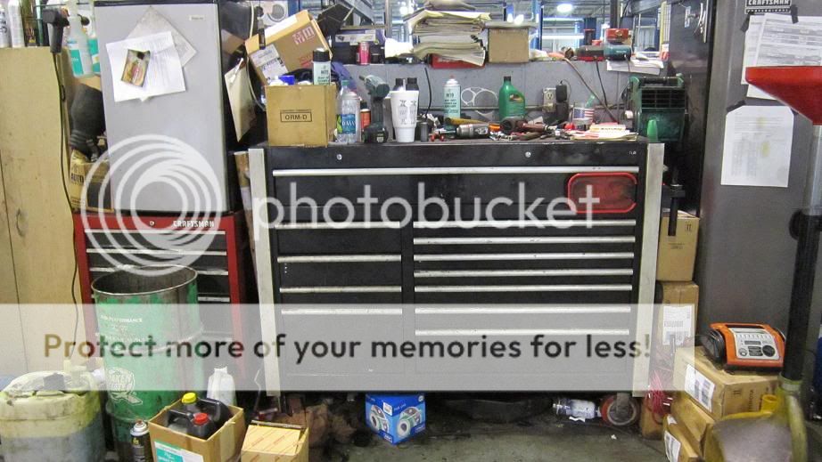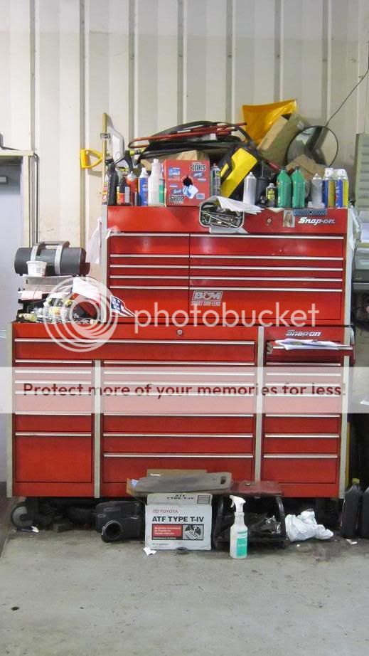 Under all this clutter is my brother's Sequoia branded toolbox.  As someone in the other thread mentioned, lots of the major branded toolboxes are made by a company called Waterloo.  If you can live without the Snap On or Matco nameplate you can save a lot of money.  A lot of the Craftsman boxes are made by Whirlpool.  I guess there isn't much difference between stamping out a dishwasher and a toolbox   :laugh: