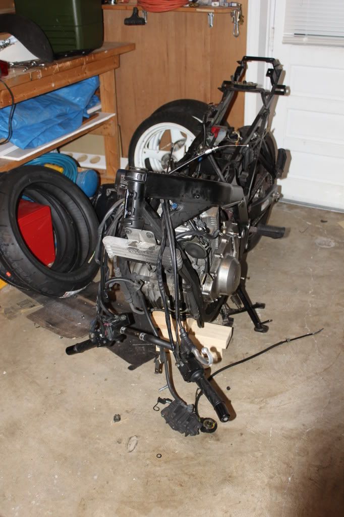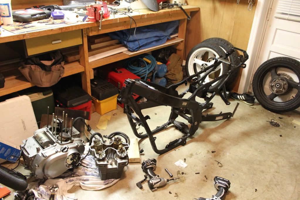 ramblings: Got it from down in Atlanta from a kid who knew nothing about moto's. he was having trouble getting it running, so he took it to a mechanic that know Nothing about moto's haha. i told the kid i'll be pulling some parts to have a look for myself. the plastics, tank, and exhaust were off when i got there. Went to pick the tank up, turned it over and gas started pouring out of the petcock. i quickly grabbed my tools and shut off the valve. the kid was astonished he said his mechanic worked for 15 minutes(before he gave up) to figure out how to turn the tank over w/o putting his finger over the hole!