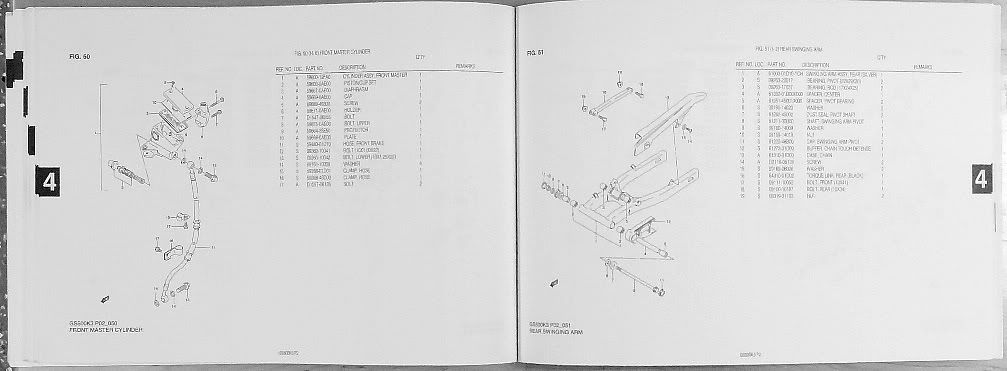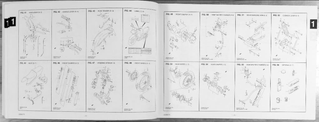This one is interesting. I haven't seen a USA version. I got this from Germany, but is in English. This is the parts catalog we always see on-line. So handy to be able to have a printed parts catalog when you're putting things back together. I would be lost if I had to always look up the parts on the internet. A complete printed book with index thumbnails in the front is now my most used manual as I assemble Phenix. Bought on ebay. $15 or so plus postage. This book has the real part numbers for the 3 types of clip-ons and the part number for the 89 bars and the 90-2000 bars. I used the 90-2000 part number for the bars, did a google search and hope to have a pair of brand new bars from a dealer in the UK.
