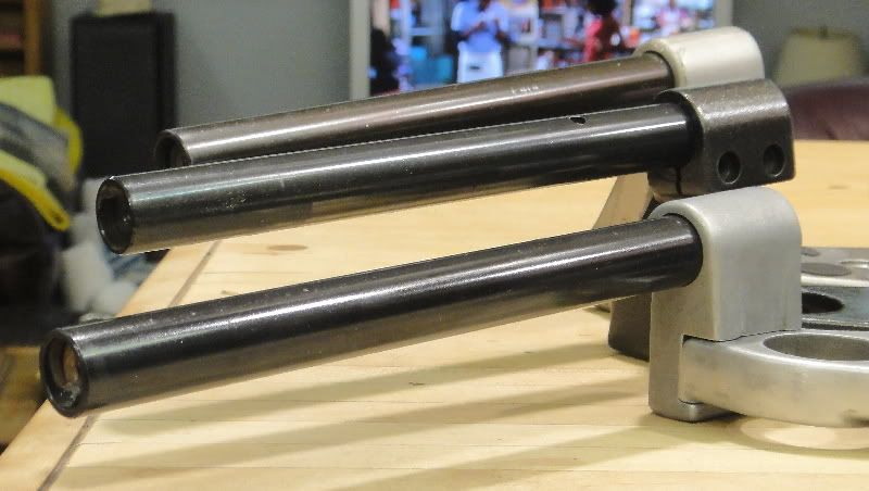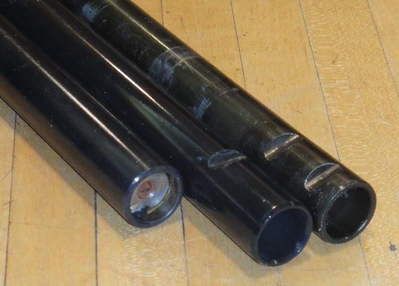 The middle is a 1989 bar with one notch. On the right is a 1990-2000 European bar. The left shows the bar end slug with the screw hole - which bottoms out! It does not go all the way through!