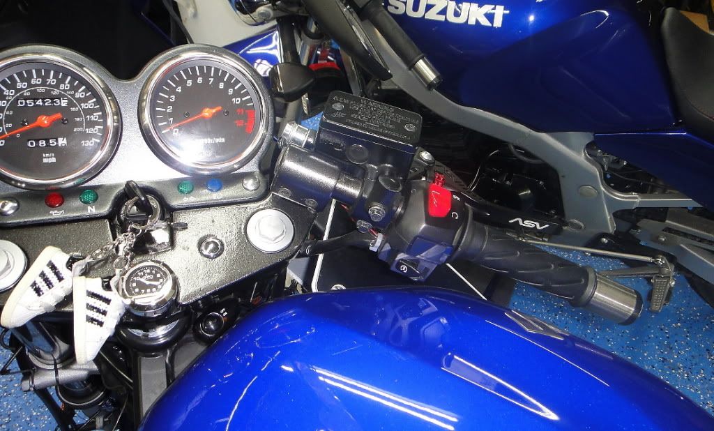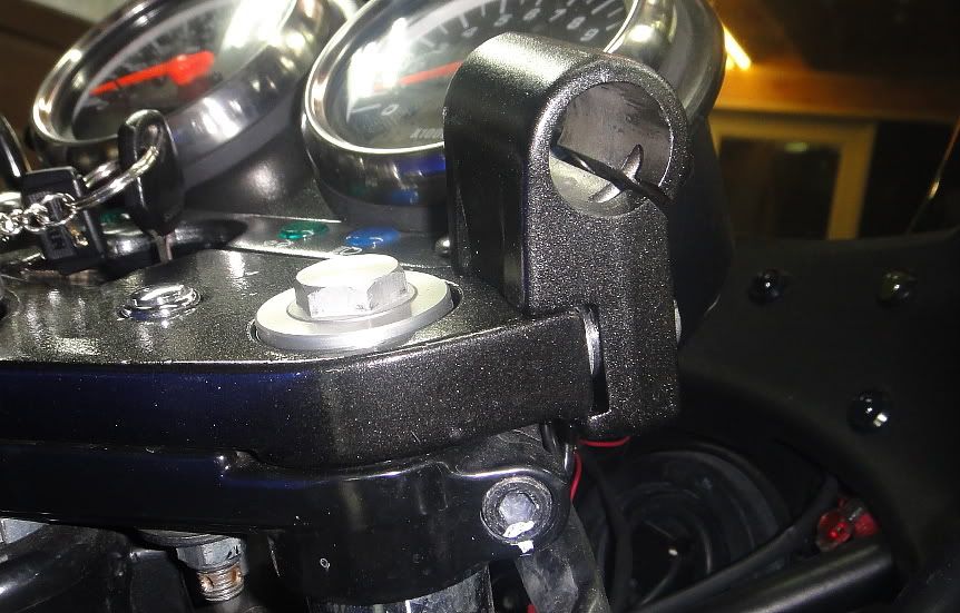 If you are changing from standard bars to the clip-ons, you will need to change the top plate. The top plates are directly interchangeable. That is, while different, they bolt on the same. Remove your standard bars (4 bolts on the handlebar holders). Remove the instrument bracket (2 bolts). Then remove the top plate by removing the 2 bolts hidden under the handle bars. THESE ARE ON TIGHT!. While you can use the same bolts to mount the clip-on top plate, there are chrome plated bolts with shallower heads for the clip-ons. You can order this from any Suzuki parts house or a parts-whore on GStwins.com. Finish it off with a little chrome plastic cap on the allen heads of the bolts. Use the ones you took off of the 4 bolts that held your standard bars or get new ones.