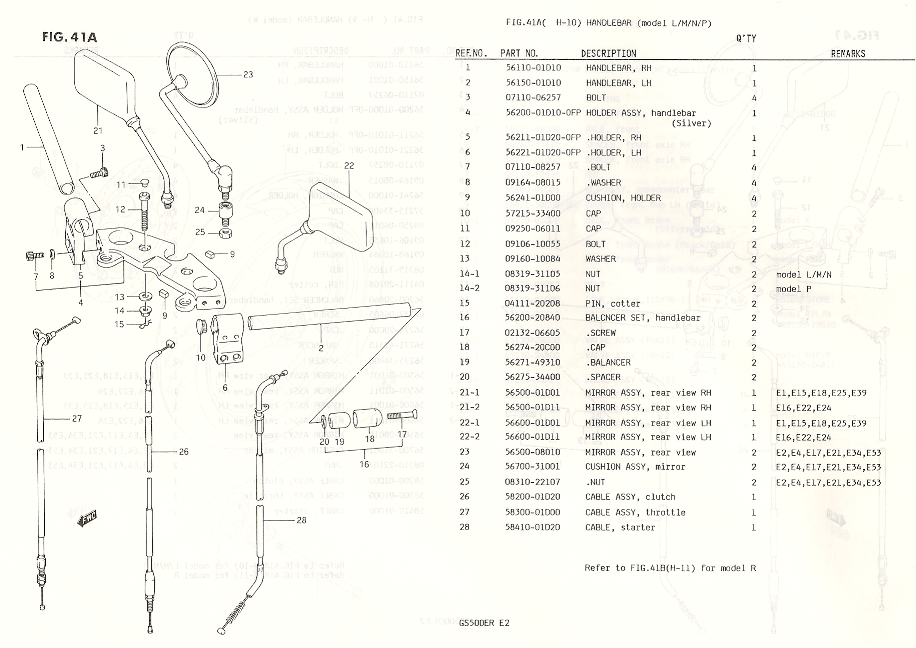 The "clip-on" OEM bars come in 3 varieties. There is one type produced only in 1989. This was sold world wide for the GS500 as an option. There are 2 other types which were sold in Europe and Canada from 1990-2000. These we refer to as the Euro Type 1 and Type 2. Technically, the European parts catalog has the 1989 bars as figure 41. The "Type 1" are figure 41A and the "Type 2" are figure 41B. We use the numbers because only recently did I acquire a European German parts catalog that identified the parts and had the part numbers.