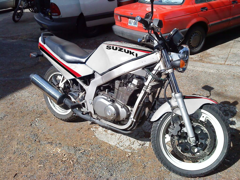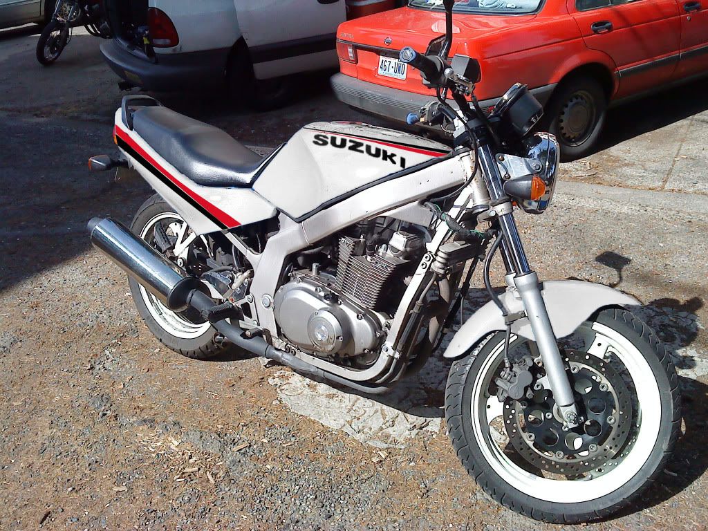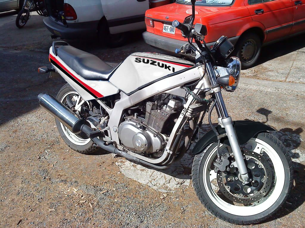 I took this picture the first day I got the bike. None of the stuff we've done to it so far are on there. I did pick up all the bondo and stuff I need in order to fix up the tank. Probably do that Saturday, start getting the white on during the week. Do the front fork brace and mudflap when I take the fender off.